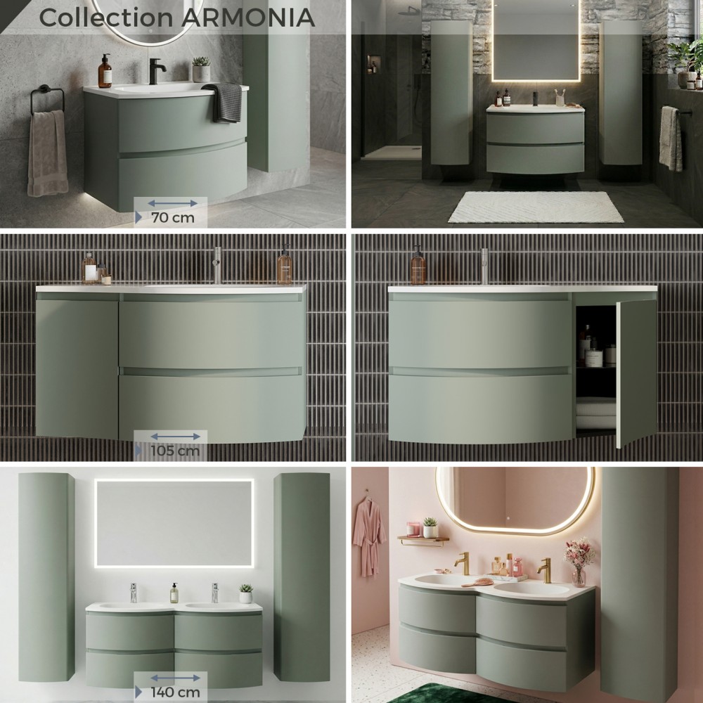 La gamme de meubles suspendus ARMONIA conjugue à la perfection esthétisme et praticité. Grâce à ses lignes courbes, elle insuffle une véritable touche de modernité et de fluidité à votre salle de bain. Pour parfaire votre aménagement et gagner en espace de rangement, des colonnes murales assorties sont disponibles. Ces meubles déjà montés en usine se distinguent par une conception robuste et une qualité de fabrication irréprochable.