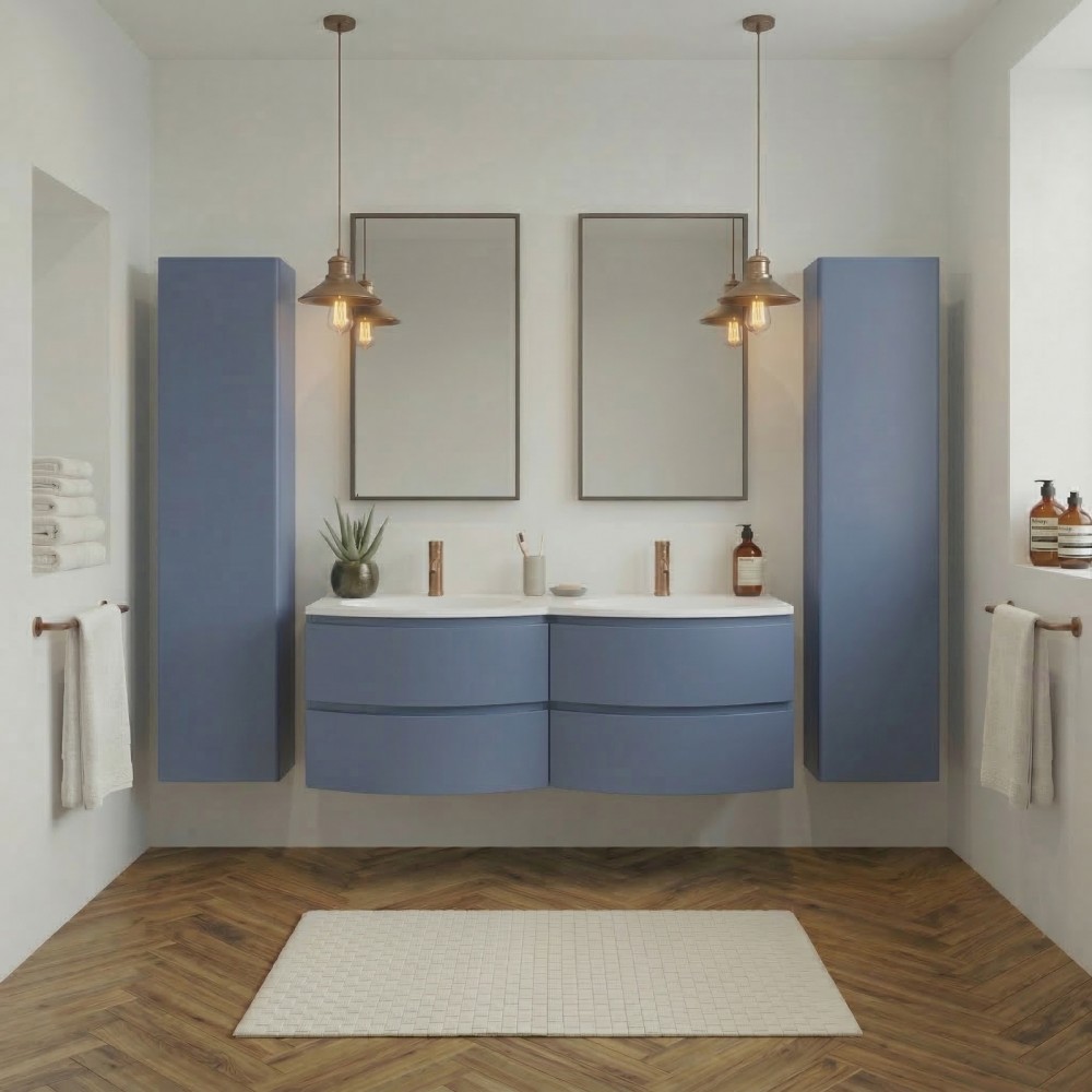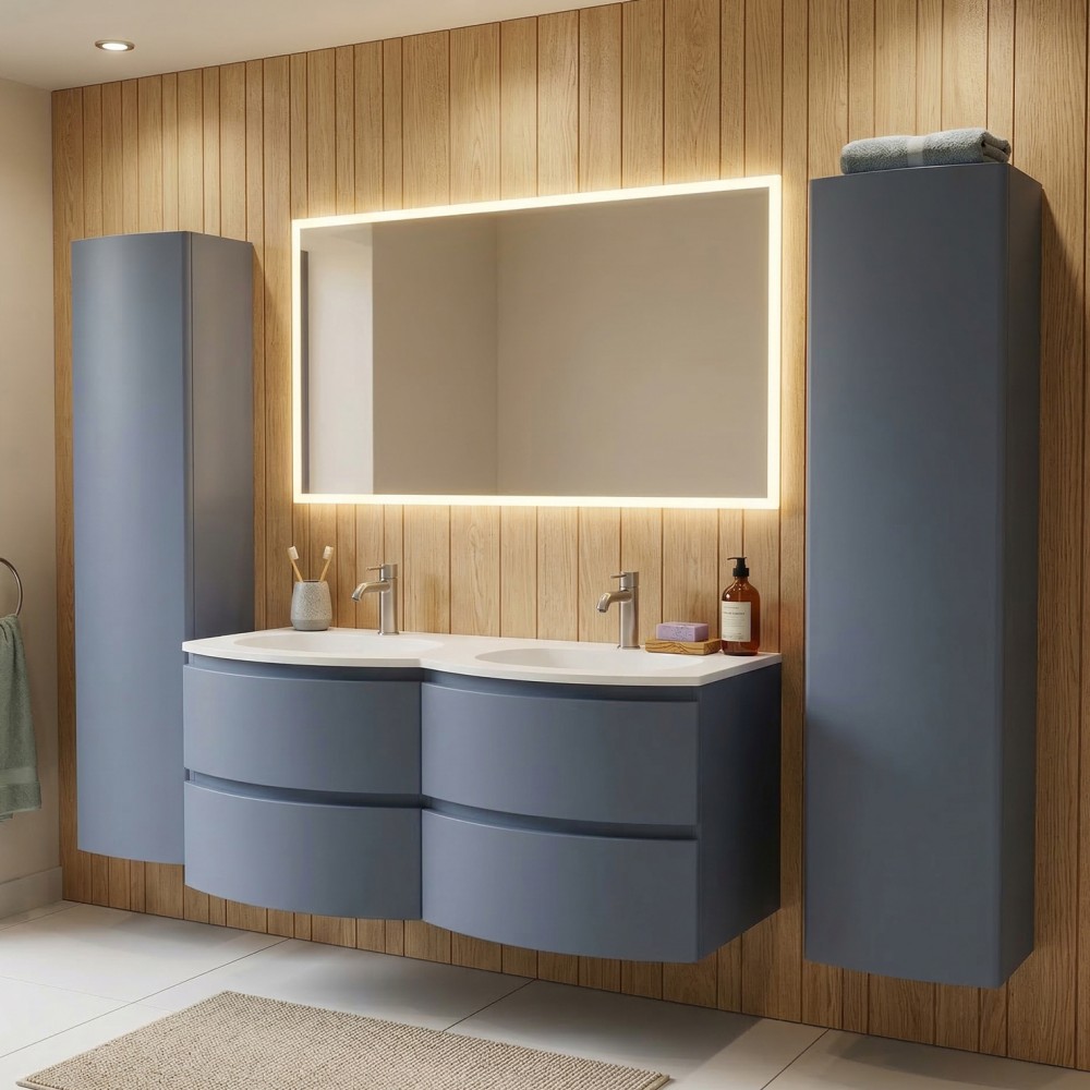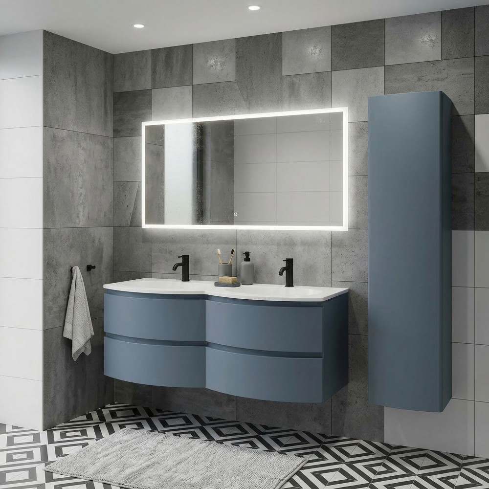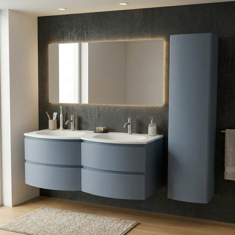 ARMONIA MEUBLE DOUBLE VASQUE ENCASTRÉE À SUSPENDRE L. 140 CM COLORIS BLEU-MER (AVEC OU SANS COLONNE MURALE).