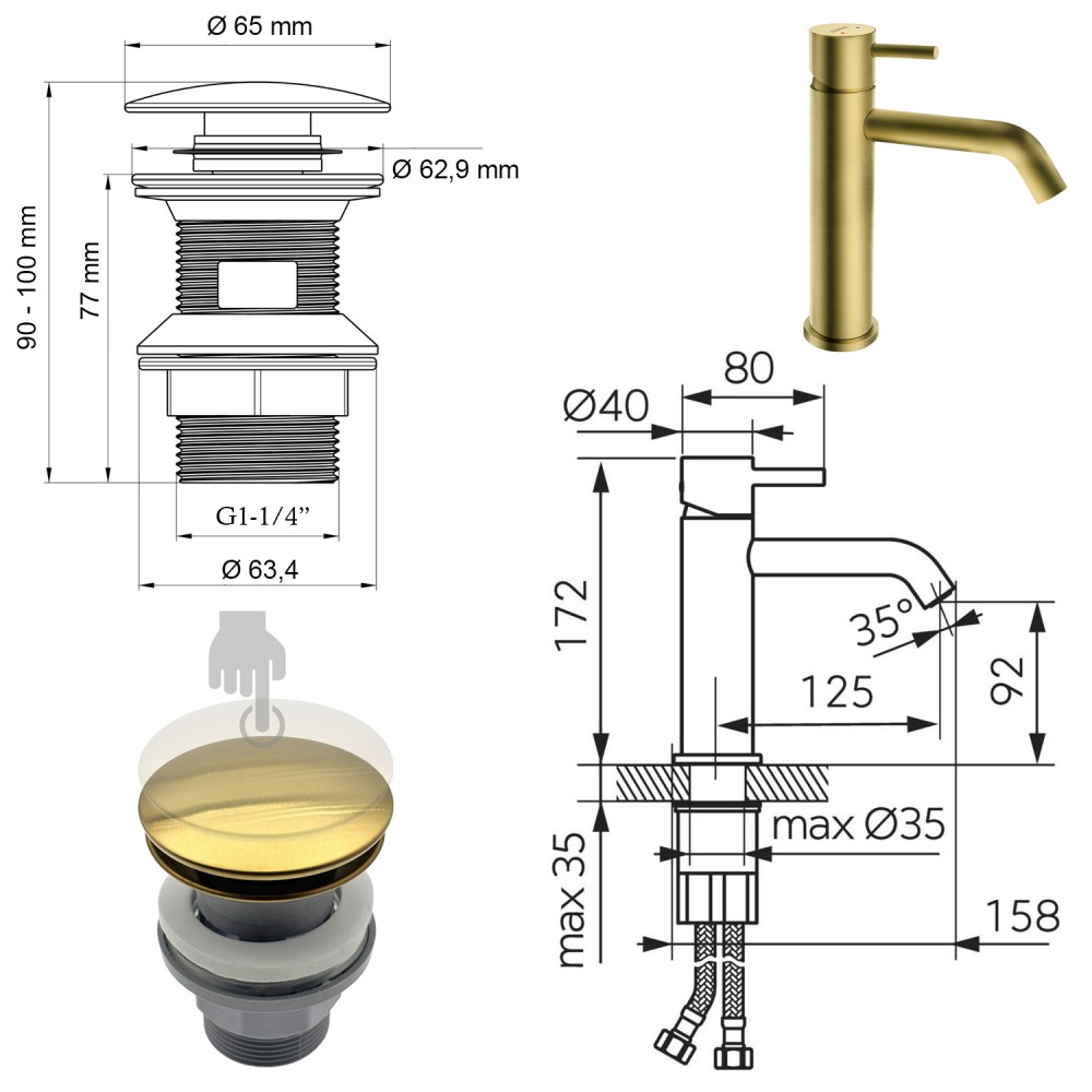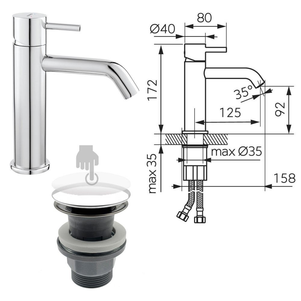 | bulletpointE | Montage monotrou standard Ø 35 mm. Kit de fixation et flexibles d'alimentation (eau chaude/froide) L. 35 cm inclus. |