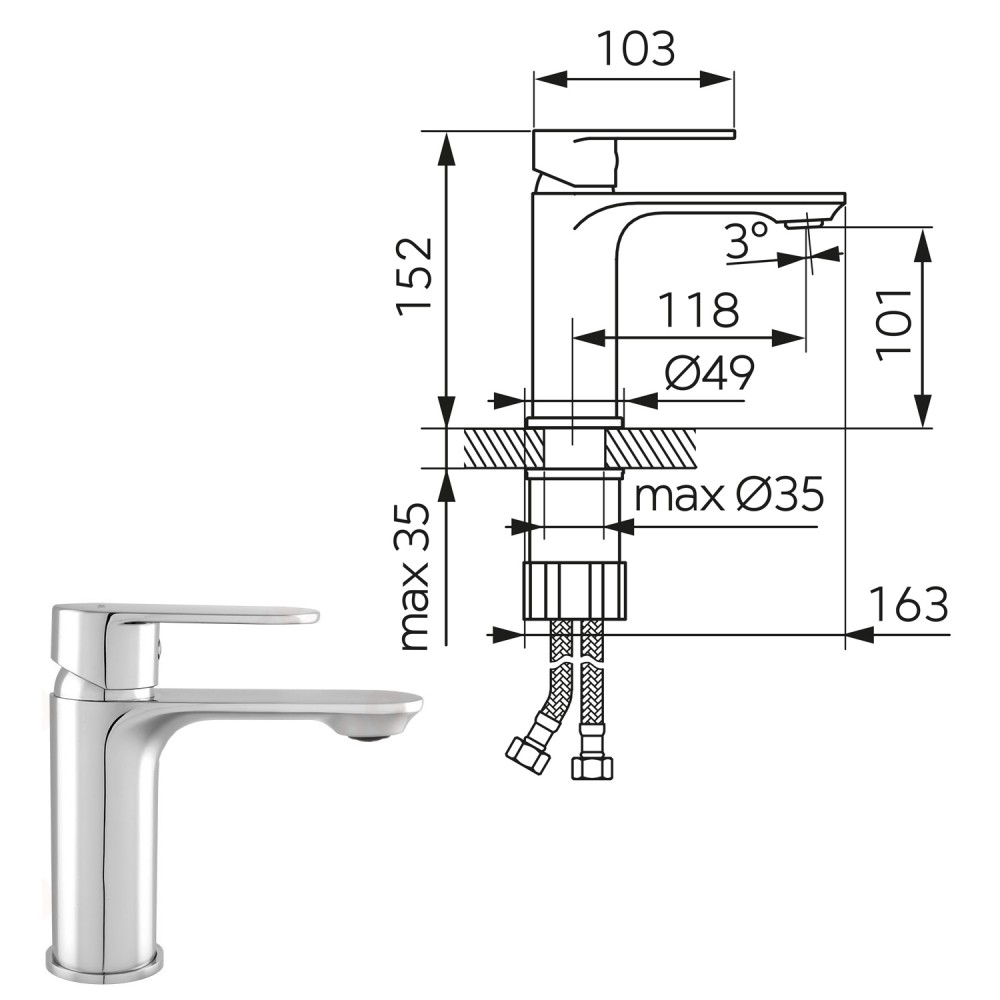 | bulletpointD | Mitigeur livré avec son kit de fixation + 2 flexibles d'alimentation (eau chaude/ froide) L. 35 cm |
